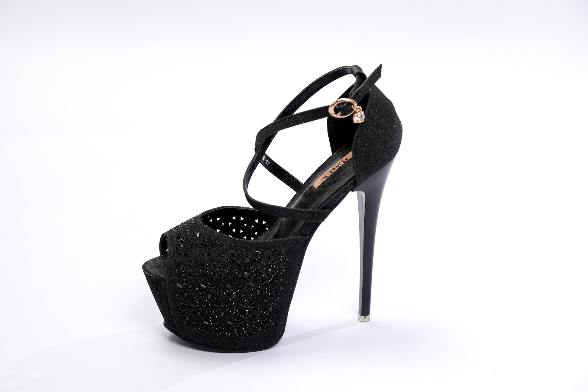Deze ultra hoge hak van 17cm is volledig gehuld in diepzwarte glitter.